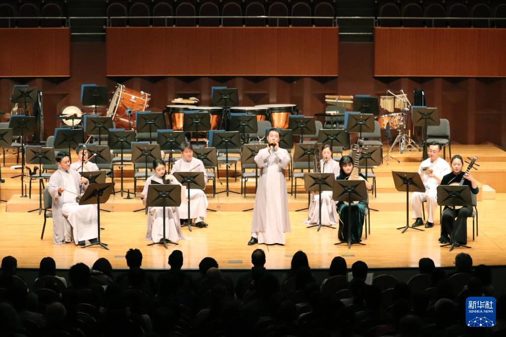 4月8日,南京民族乐团在日本大阪交响音乐厅演奏《百鸟朝凤》。新华社记者 杨光 摄