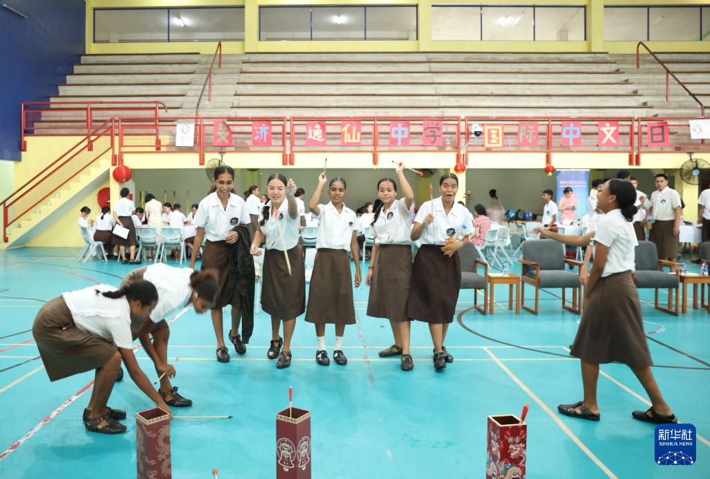 4月15日,在斐济首都苏瓦,当地学生在“国际中文日”庆祝活动上体验投壶。