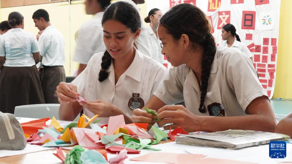 4月15日,在斐济首都苏瓦,当地学生在“国际中文日”庆祝活动上体验折纸。