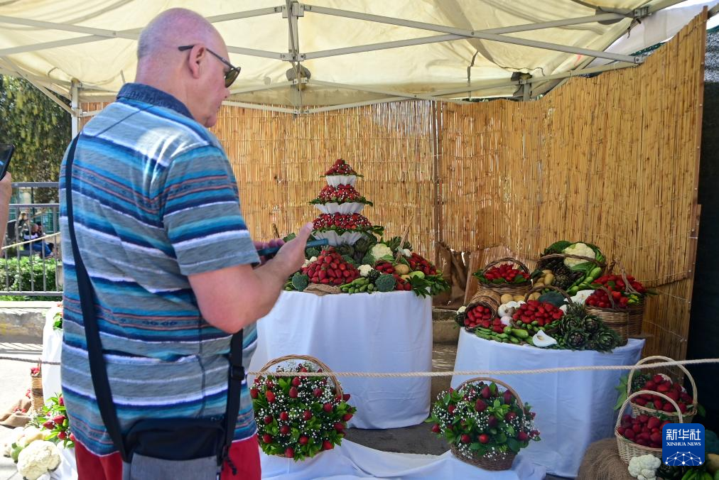 4月27日,在马耳他姆贾尔,游客观看用草莓和蔬菜搭建的装饰造型。