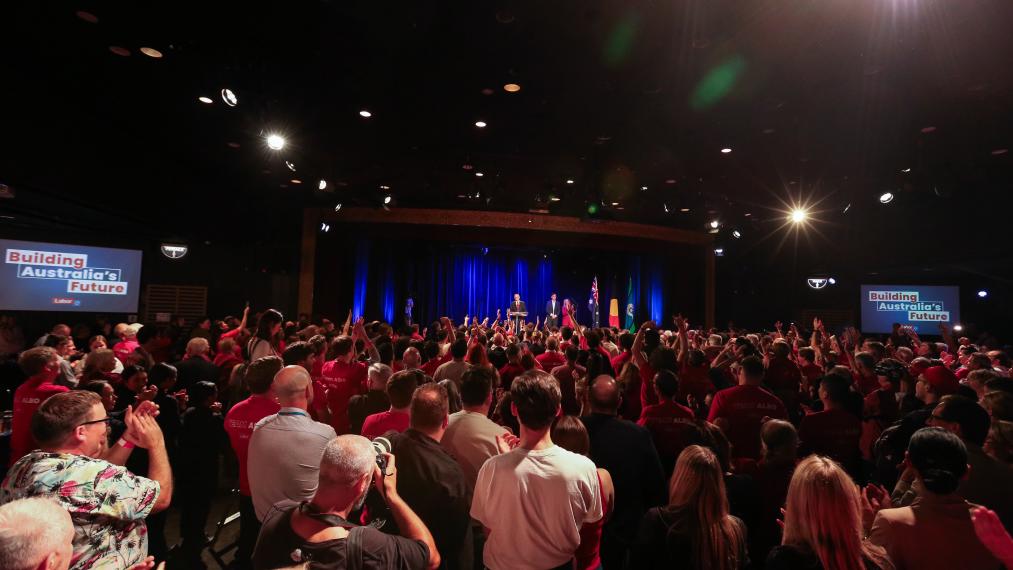 5月3日,在澳大利亚悉尼,工党支持者在竞选集会上庆祝胜利。新华社记者马平摄