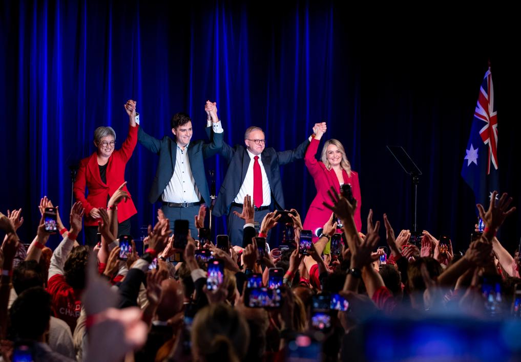 5月3日,在澳大利亚悉尼,澳大利亚总理阿尔巴尼斯(右二)与澳大利亚外长黄英贤(左一)在竞选集会上庆祝胜利。新华社记者马平摄