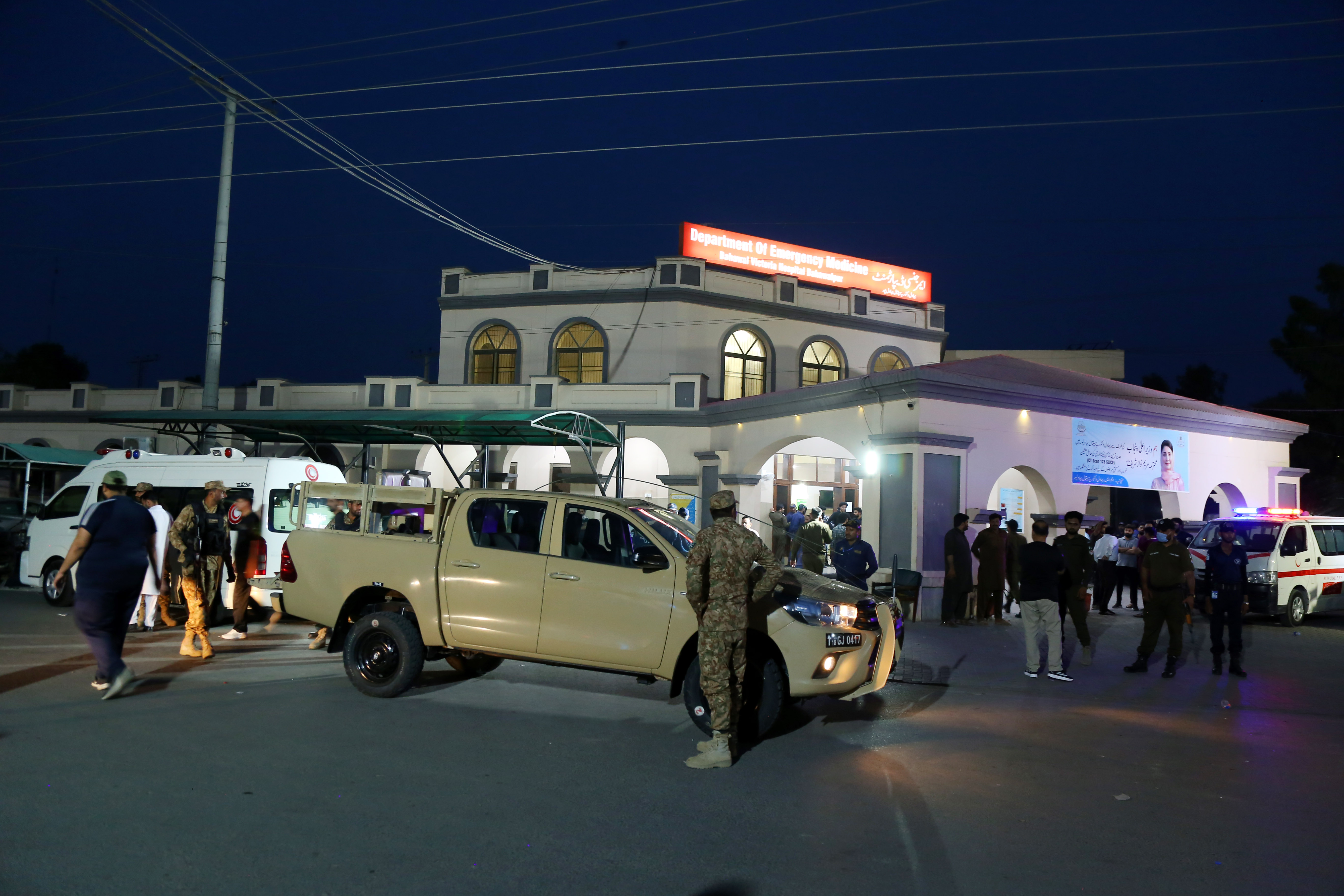 5月7日,救护车停在巴基斯坦东部旁遮普省谢赫布拉地区穆里德盖镇遭印度导弹破坏的建筑附近。新华社发(萨贾德摄)