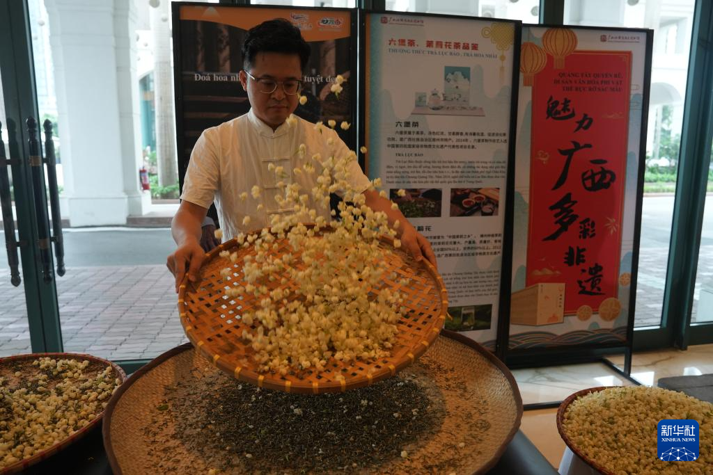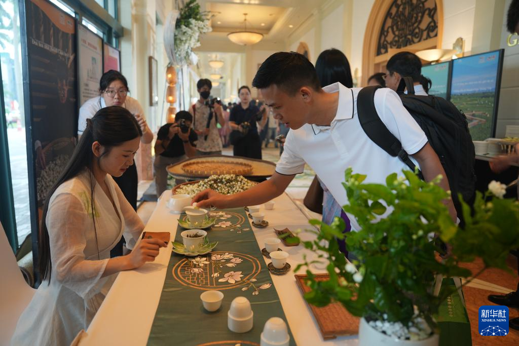 5月21日,中方工作人员在越南首都河内举办的推介活动上展示茉莉花茶工艺。新华社记者 胡佳丽 摄