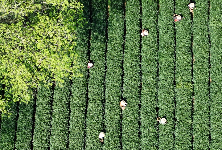 2025年3月25日,茶农在杭州西湖龙井茶园里采摘明前茶嫩芽(无人机照片)。新华社发(龙巍摄)