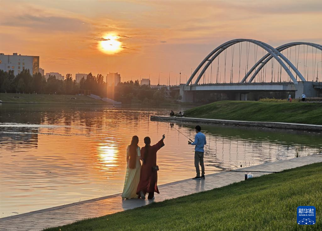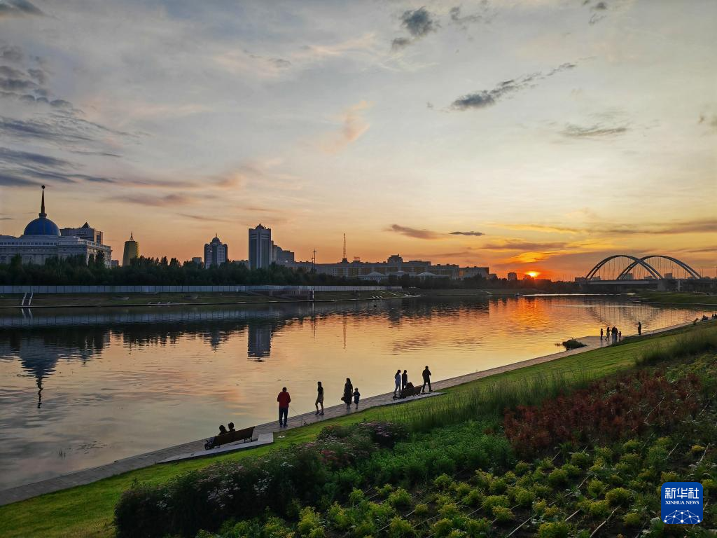 6月12日傍晚,人们在哈萨克斯坦首都阿斯塔纳的伊希姆河畔休闲。