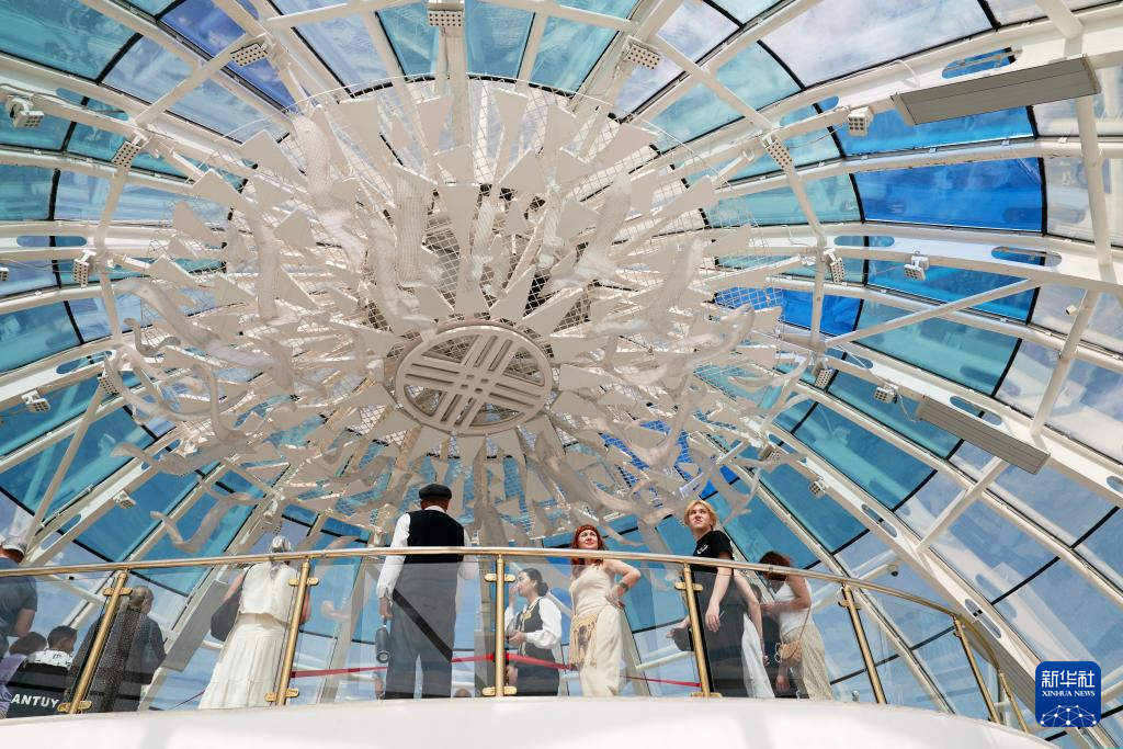 6月14日,在哈萨克斯坦首都阿斯塔纳,游客在巴伊杰列克观景塔塔顶参观。