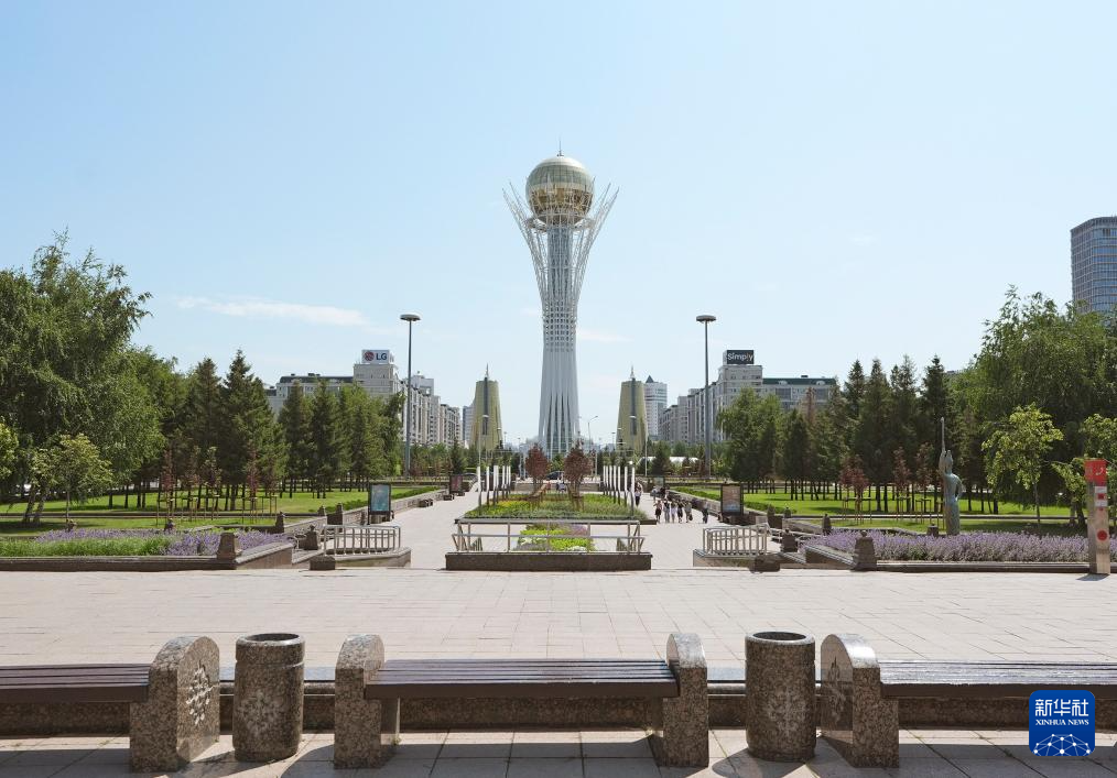 这是6月11日在哈萨克斯坦首都阿斯塔纳拍摄的巴伊杰列克观景塔。