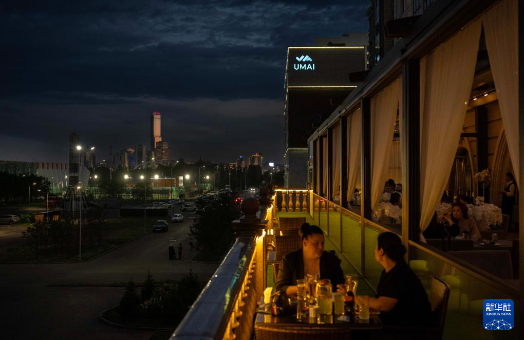 6月12日,人们在哈萨克斯坦首都阿斯塔纳的一家餐厅用餐,远处是地标性建筑阿布扎比大厦。