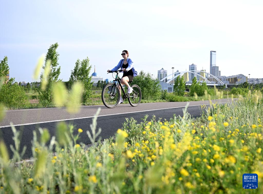 6月11日,一名女子在哈萨克斯坦首都阿斯塔纳的铁人三项公园骑行。