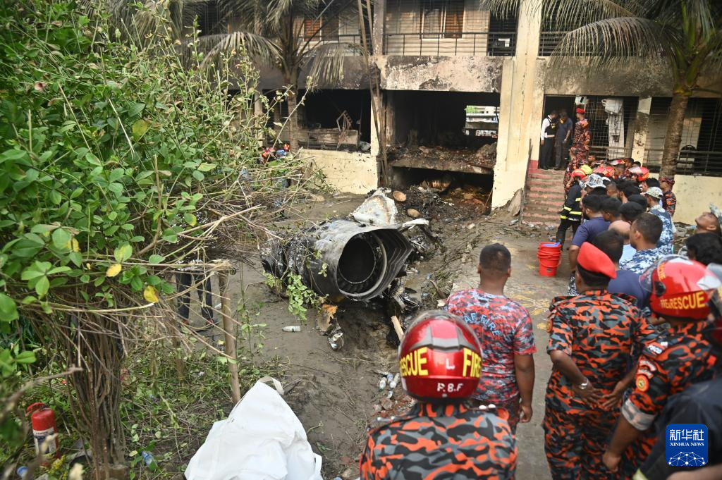 7月21日,在孟加拉国首都达卡,消防人员在教练机坠毁现场工作。新华社发(哈比卜·拉赫曼摄)