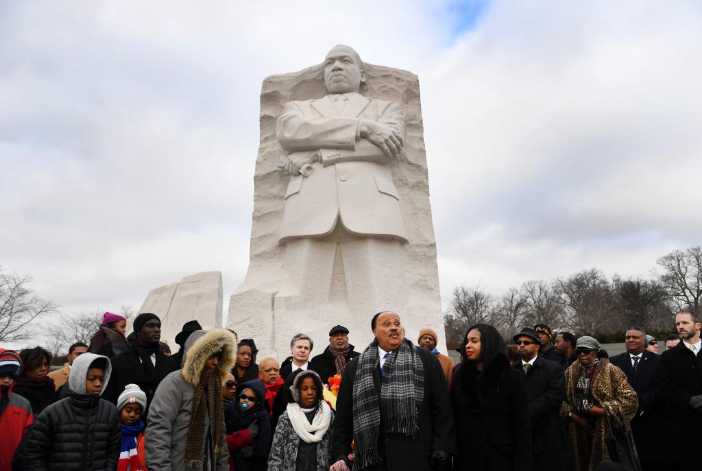 2018年1月15日,在美国首都华盛顿,马丁·路德·金的儿子马丁·路德·金三世(中)在纪念活动上讲话。新华社记者殷博古摄