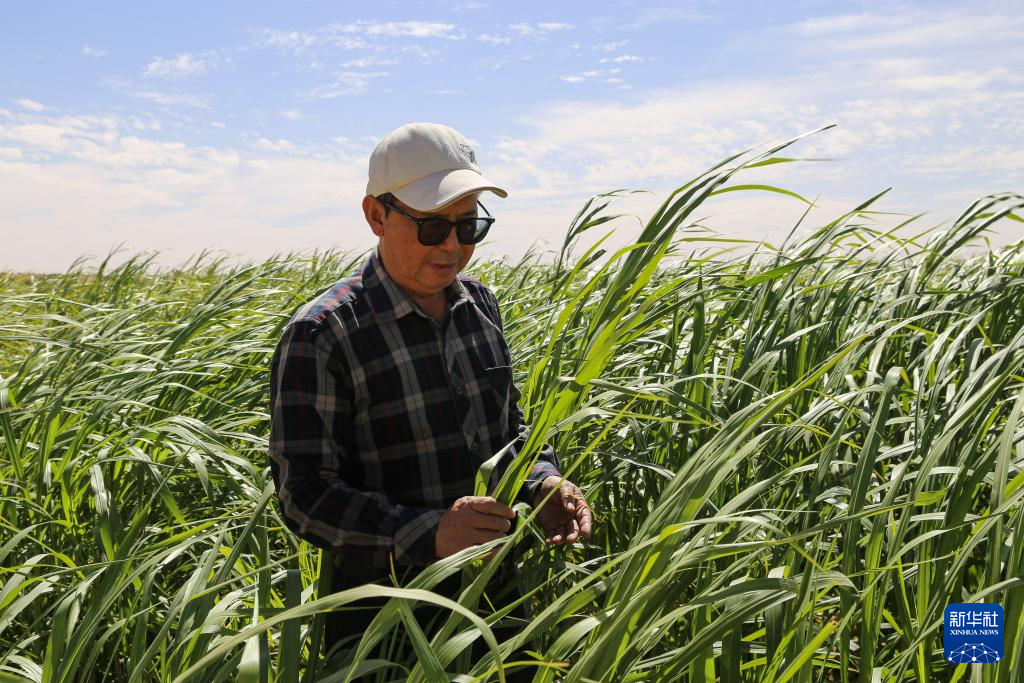 1月18日,在毛里塔尼亚伊迪尼村,中国援毛里塔尼亚畜牧业技术示范中心主任张洪恩在菌草田查看菌草生长情况。