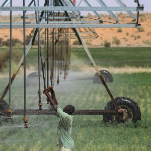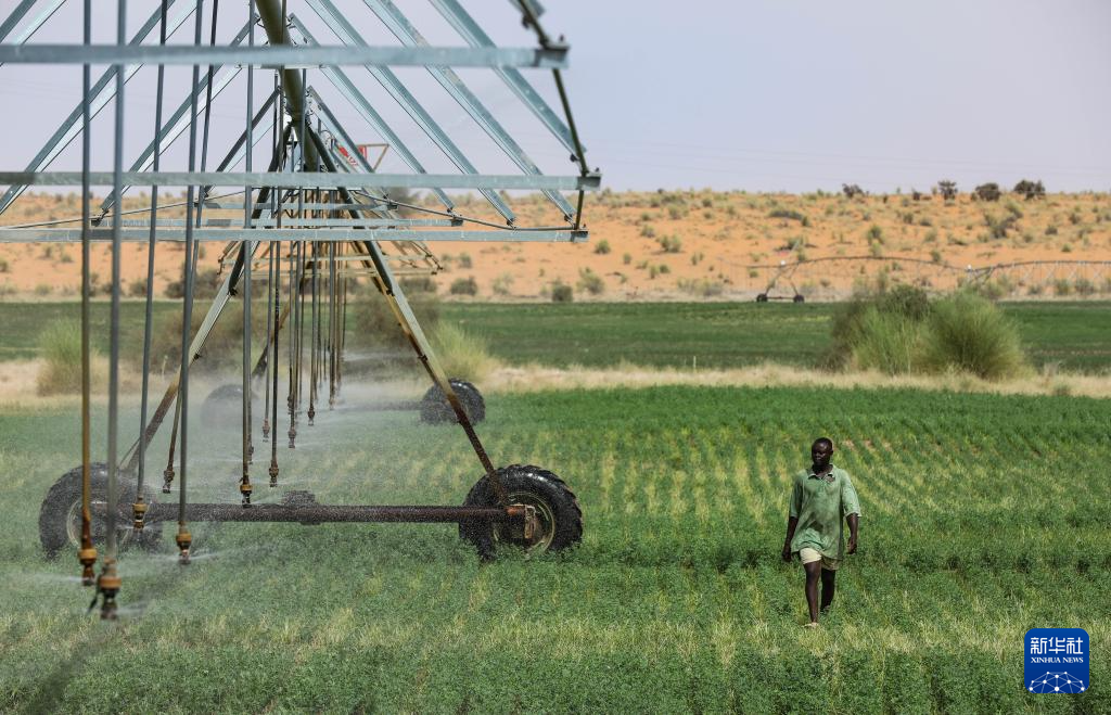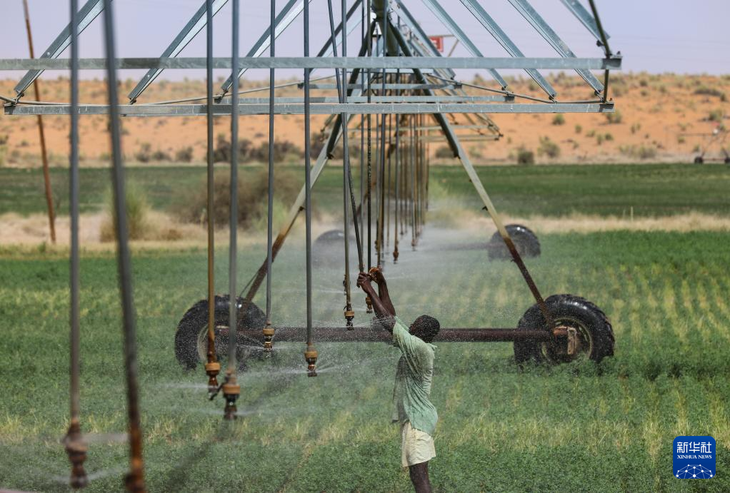7月18日,在毛里塔尼亚伊迪尼村,牧民在中国援毛里塔尼亚畜牧业技术示范中心的紫花苜蓿田检查喷灌设备的运行情况。