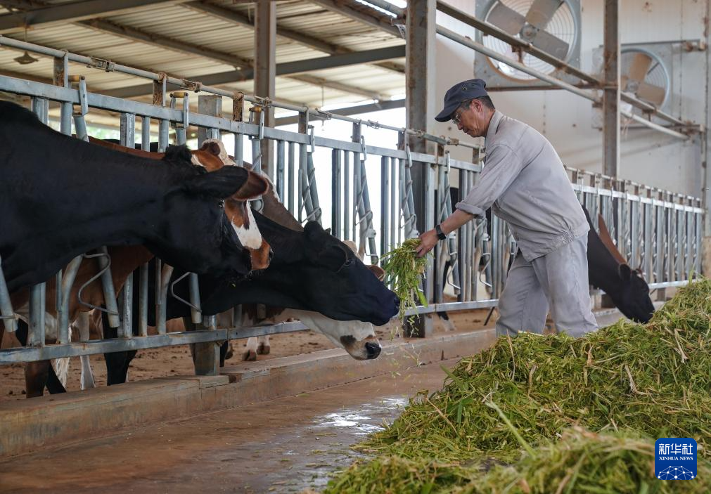 7月18日,在毛里塔尼亚伊迪尼村,牧民在中国援毛里塔尼亚畜牧业技术示范中心给牛群喂食菌草饲料。