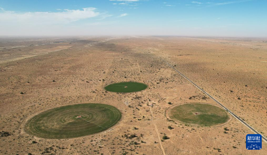 这是1月18日在毛里塔尼亚伊迪尼村中国援毛里塔尼亚畜牧业技术示范中心拍摄的三处紫花苜蓿田(无人机照片)。