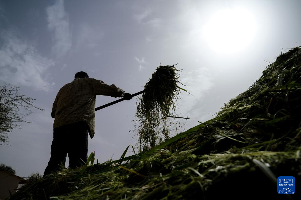 7月18日,在毛里塔尼亚伊迪尼村,牧民在中国援毛里塔尼亚畜牧业技术示范中心处理菌草。