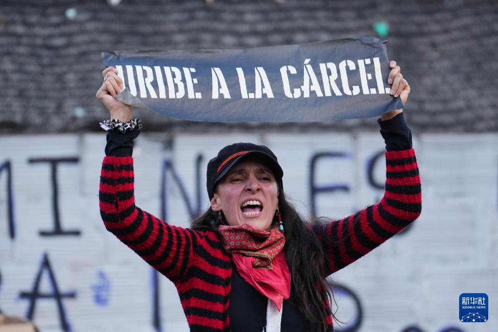 8月1日,在哥伦比亚波哥大,一名女子手持标语在法院外反对前总统乌里韦。新华社发(安德烈斯·莫雷诺摄)