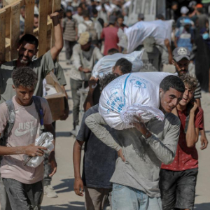 8月5日,在加沙地带拜特拉希耶,人们搬运援助物资。