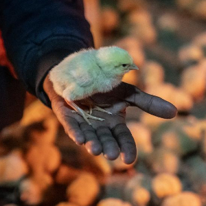 8月7日,在位于南非约翰内斯堡南部诺姆塞莱拉农业项目的农场内,一名工人手托一只小鸡。
