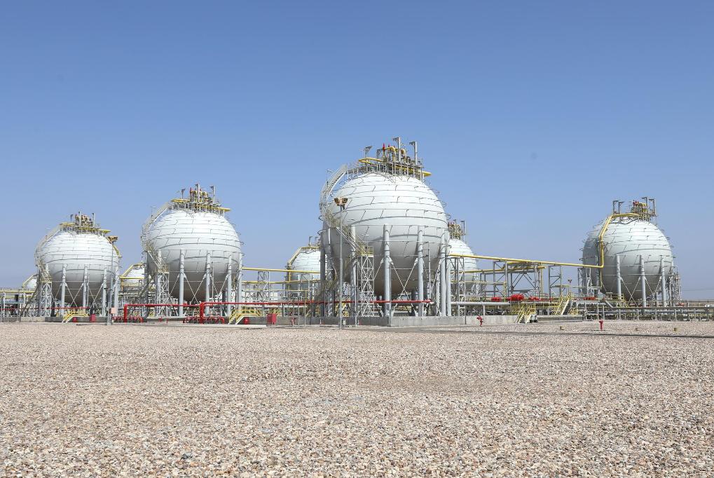 这是3月27日在伊拉克南部米桑省哈法亚油田内拍摄的哈法亚天然气处理厂球罐区。新华社发(哈利勒·达伍德摄)