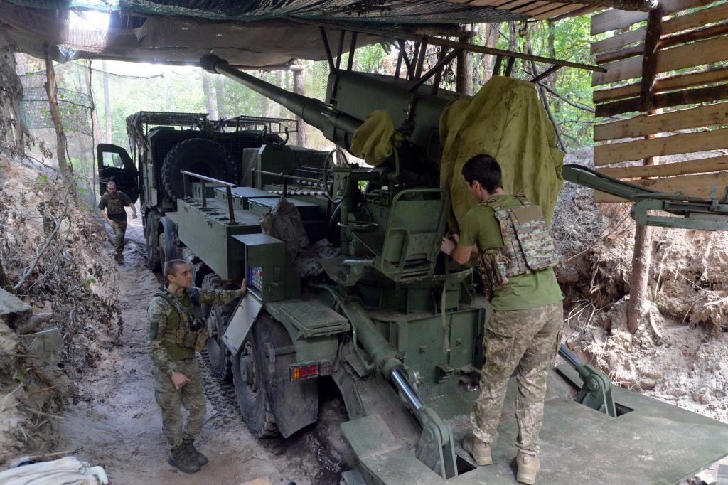 8月13日,在乌克兰苏梅州前线地区,乌军士兵为自行火炮覆盖炮衣。新华社发(彼得·德鲁克摄)