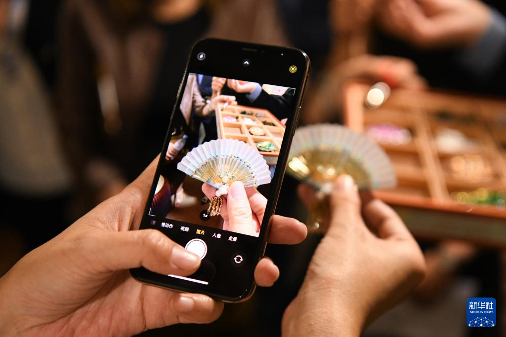 8月22日,在瑞士伯尔尼中国文化中心,嘉宾在 “安善萃锦——中式生活美学展”上拍摄精美饰品。新华社记者 连漪 摄