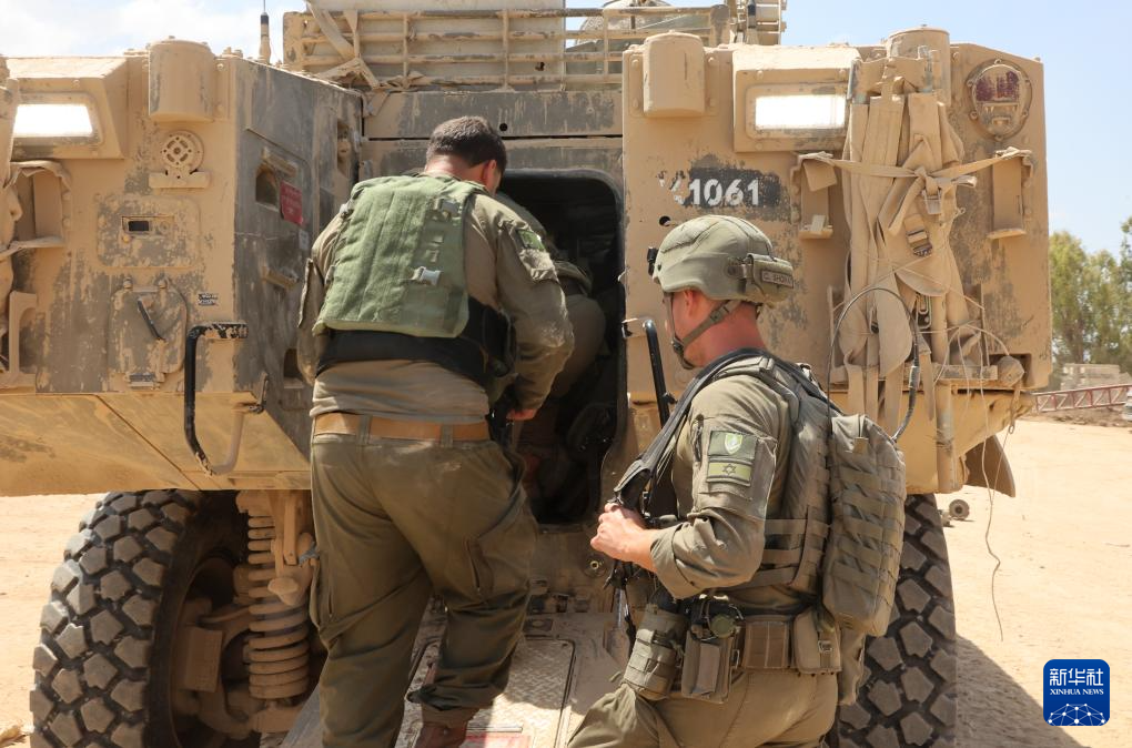 这是8月28日从加沙边境以色列一侧拍摄的以军装甲车和以军士兵。新华社发(吉尔·科恩·马根摄)