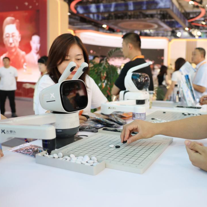 9月11日,一款下棋机器人在文旅服务专题展区与参观者对弈。