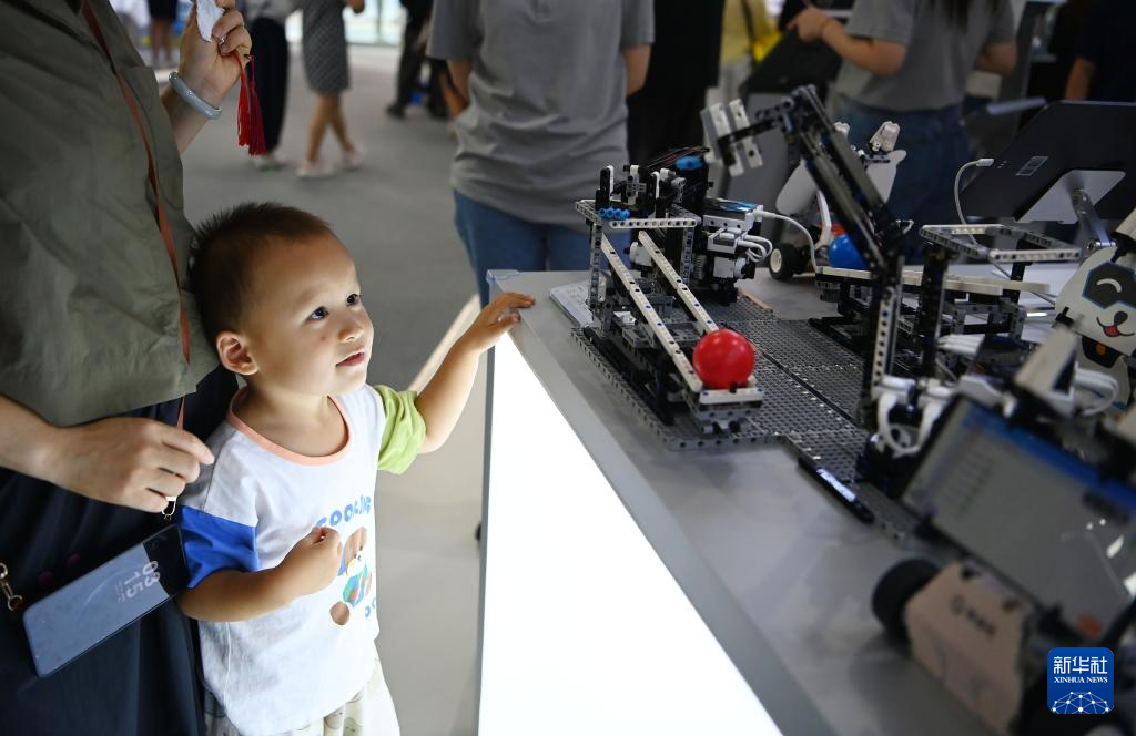 9月11日,在服贸会教育服务专题展区,一名小朋友在猿编程展台观看最新AI教育产品。