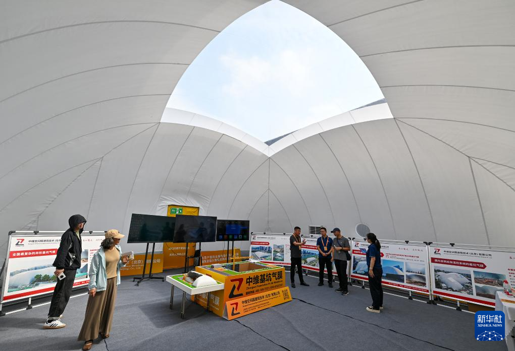 9月12日,参观者在服贸会的中维空间膜建筑技术(北京)有限公司的展区了解基坑气膜技术。该技术方案可提供无结构支撑的超大空间,起到工程施工防尘、降噪效果,创造全天候施工条件,缩短施工周期。