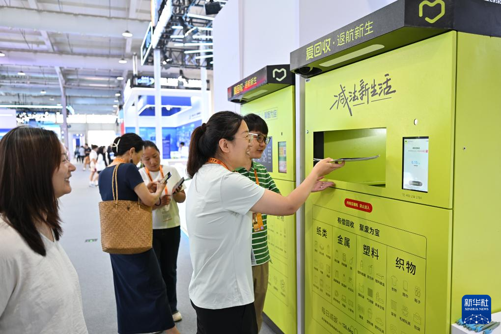 9月12日,参观者在服贸会爱回收展台体验智能回收机。