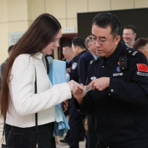 9月15日,上海移民管理警察帮助俄罗斯籍旅客完成入境卡填写。
