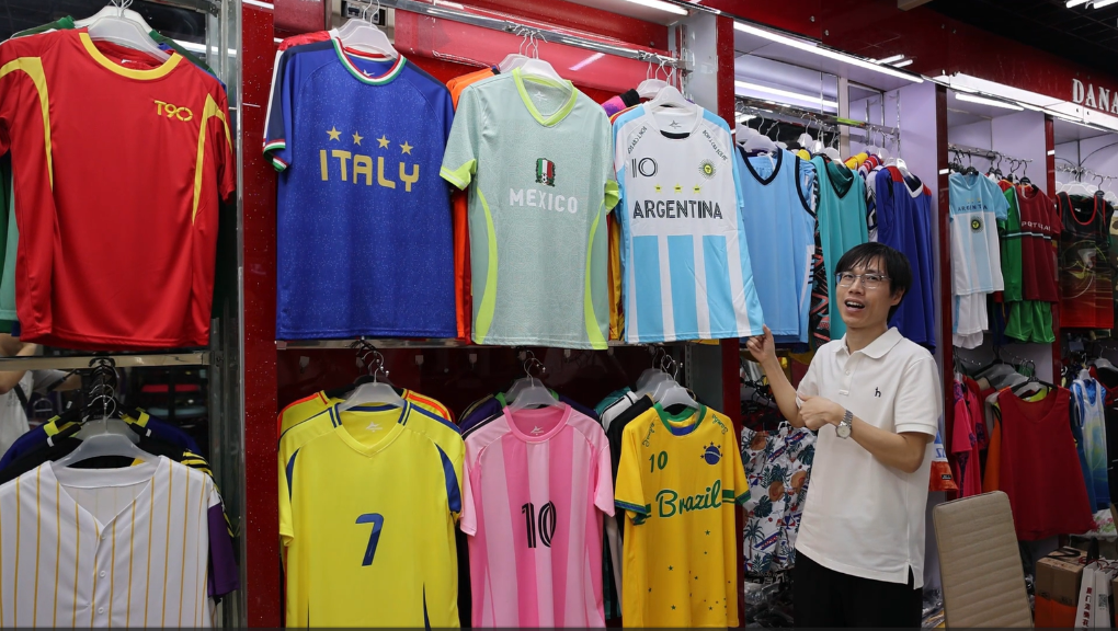 义乌国际商贸城经营户温从见展示他为2026年美加墨世界杯设计的原创球迷服。新华社发