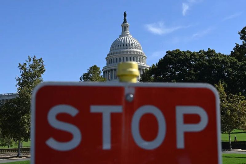 这是10月1日在美国华盛顿拍摄的美国国会大厦和交通标志。新华社记者 李睿 摄