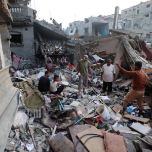 9月28日,在加沙地带努赛赖特难民营,巴勒斯坦人查看以军袭击后的建筑废墟。新华社/法新