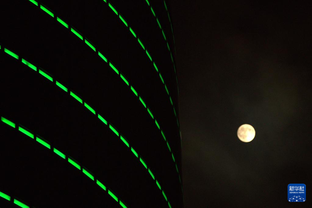 这是10月6日在阿塞拜疆首都巴库的火焰塔拍摄的月亮。