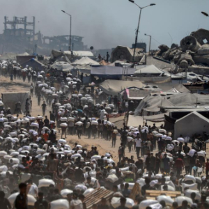 7月27日,在加沙地带北部城镇拜特拉希亚,人们领取通过边境口岸进入加沙的援助物资。新华社发(里泽克·阿卜杜勒贾瓦德摄)