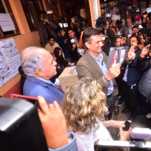 10月19日,在玻利维亚拉巴斯,玻利维亚右翼“自由”联盟候选人、前总统豪尔赫·基罗加在一处投票点展示手中投票证件。