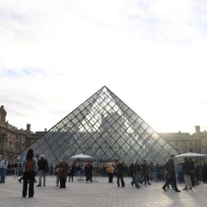 10月22日,在法国巴黎,大量游客聚集在卢浮宫博物馆的玻璃金字塔入口前。