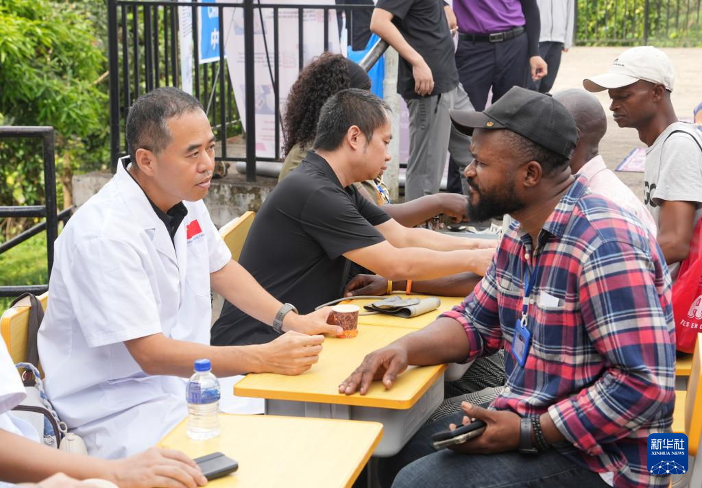 10月22日,在塞拉利昂首都弗里敦,第26批中国援塞拉利昂医疗队成员在活动中为当地居民把脉。新华社发(第26批中国援塞拉利昂医疗队供图)