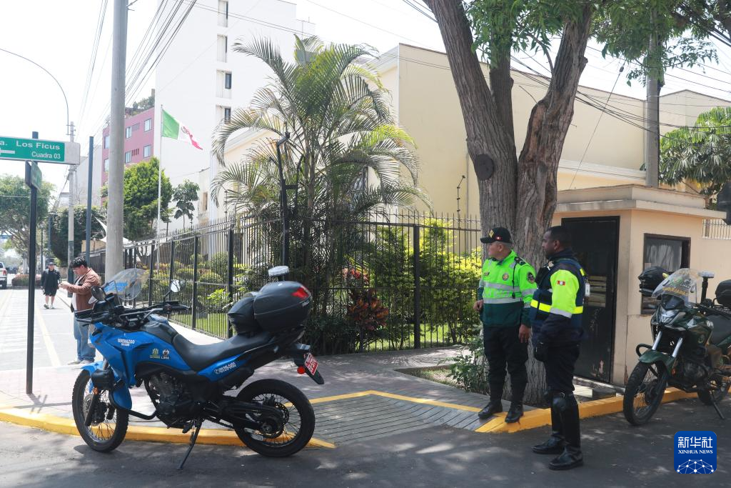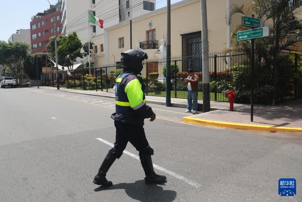 11月4日,在秘鲁首都利马,警察在墨西哥驻秘鲁大使馆外执勤。新华社发(玛丽安娜·巴索摄)