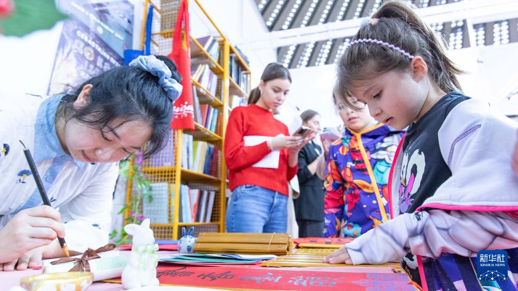 10月26日,在塞尔维亚首都贝尔格莱德,小朋友在贝尔格莱德国际书展的“我在塞尔维亚阅读中国”图书专区体验中国文化。新华社发(王韡摄)