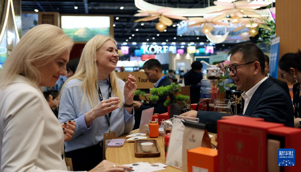 11月4日,两名女子在2025伦敦世界旅游交易会中国展区品尝中国茶。新华社记者 李颖 摄