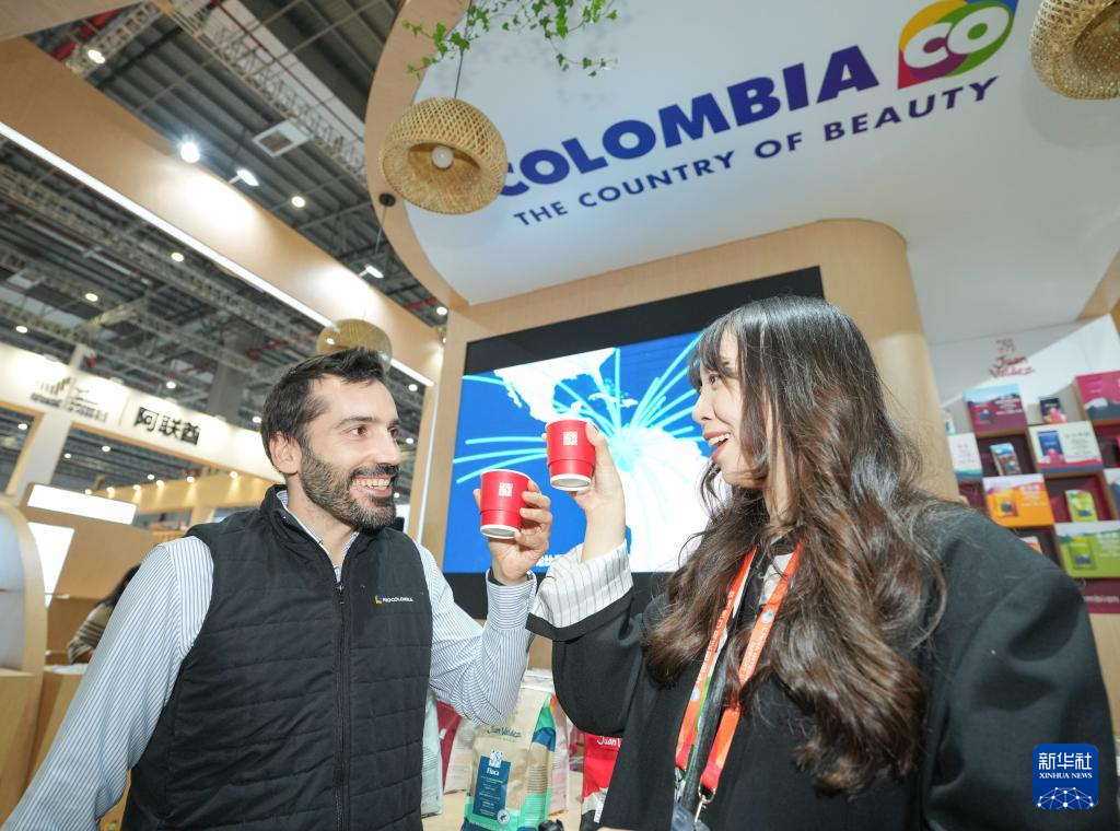 11月5日,在第八届进博会国家展哥伦比亚馆,参展商(左)和媒体记者一起品尝咖啡。