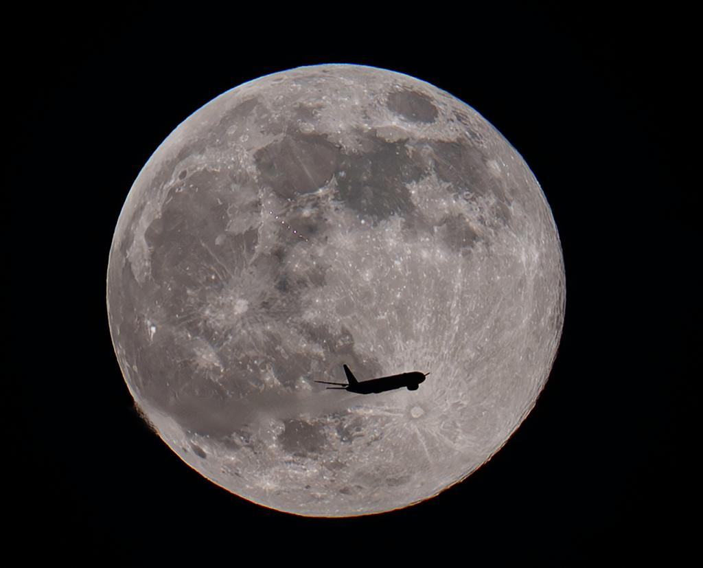 这是11月5日在科威特首都科威特城拍摄的“超级月亮”和一架飞机。