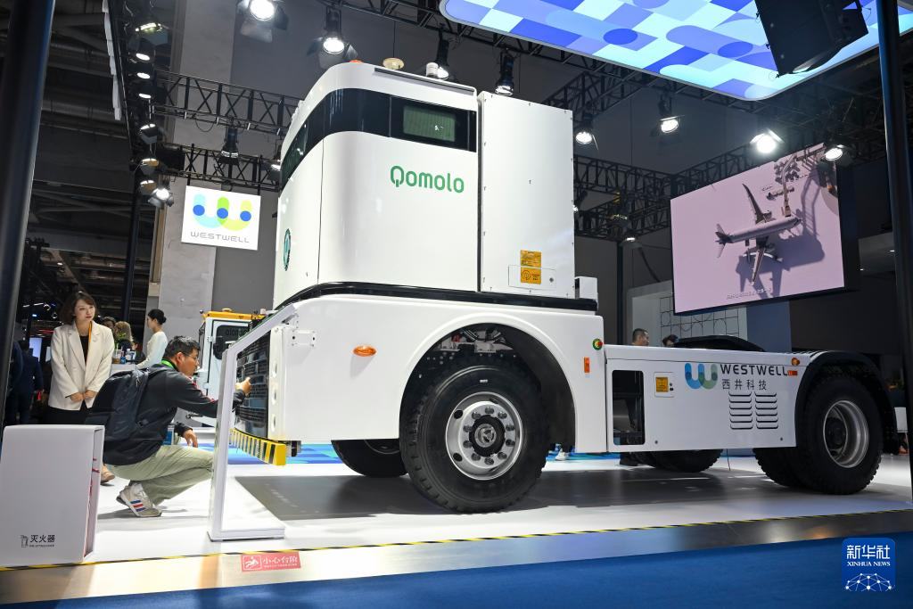 11月6日,观众(右)在第八届进博会汽车及智慧出行展区西井科技展台拍摄展品Q-Truck全时无人驾驶集卡。