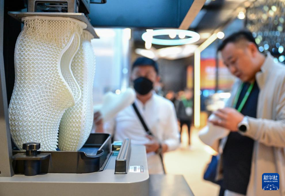 这是11月6日在第八届进博会技术装备展区拍摄的一款全3D打印鞋。