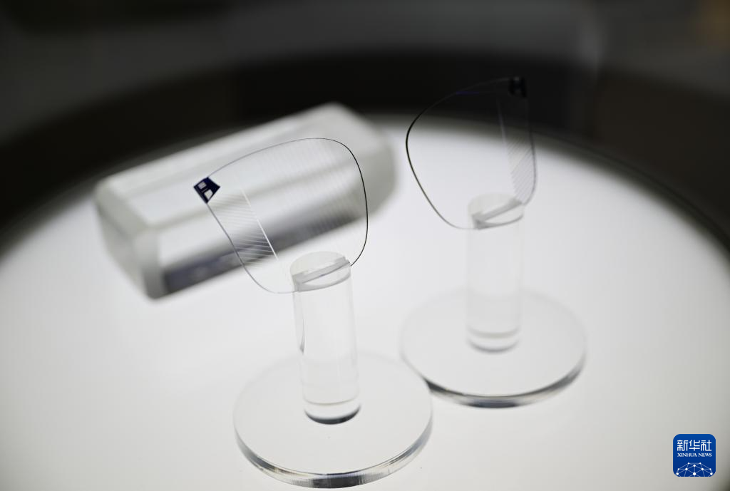 这是11月6日在第八届进博会技术装备展区拍摄的一款增强现实眼镜镜片。