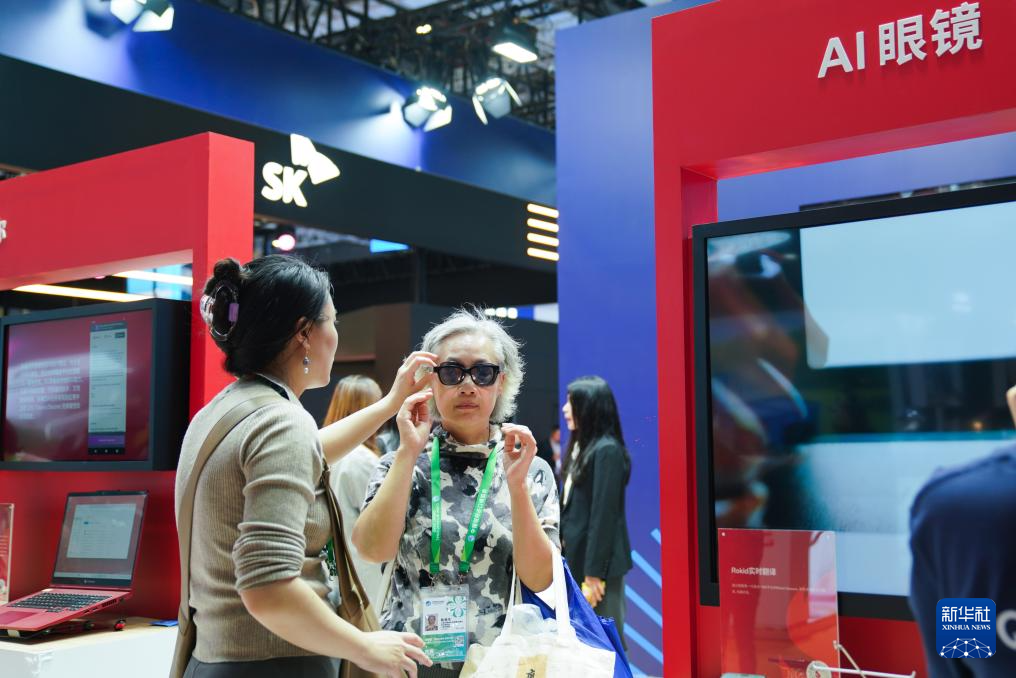 11月6日,参观者在国家会展中心(上海)技术装备展区高通公司展台试戴一款AI眼镜。